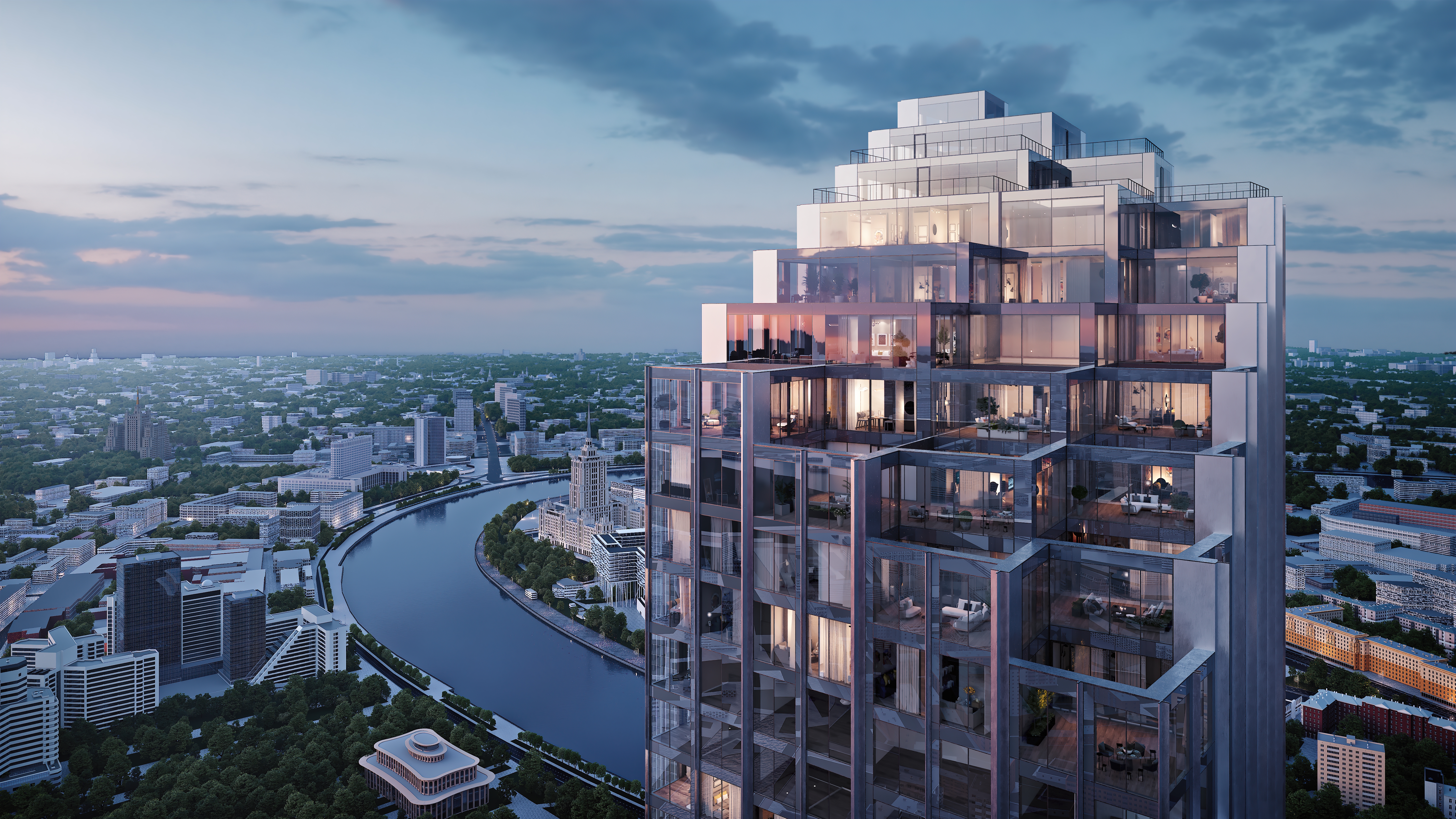 Расположенные на 79-82 этажах квартиры с потолками 3,8 метра и панорамным остеклением превращают жилое пространство в бесконечный диалог с небом и городом.